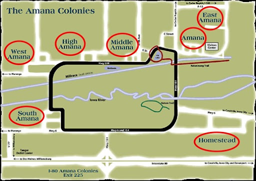 在十八世紀初時,因為某位先祖主張要有虔誠的信仰,而有這個因共同的信仰的村落出現。但因壓迫與經濟壓力,他們於1843年從德國移居至美國的水牛城,之後又因人數的增加,在1855年搬遷至 Iowa 州。(因這邊地便宜,農地又多!) 他們將村落取名為 Amana 表示"remain true",出自Song of Solomon 4:8*。他們集資購買了 25,000 英畝的地,分為六個小村落:Amana, East Amana, West Amana, South Amana, High Amana & Middle Amana。1861年又加入 Homestead。